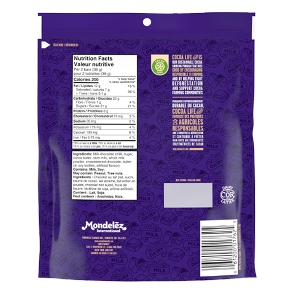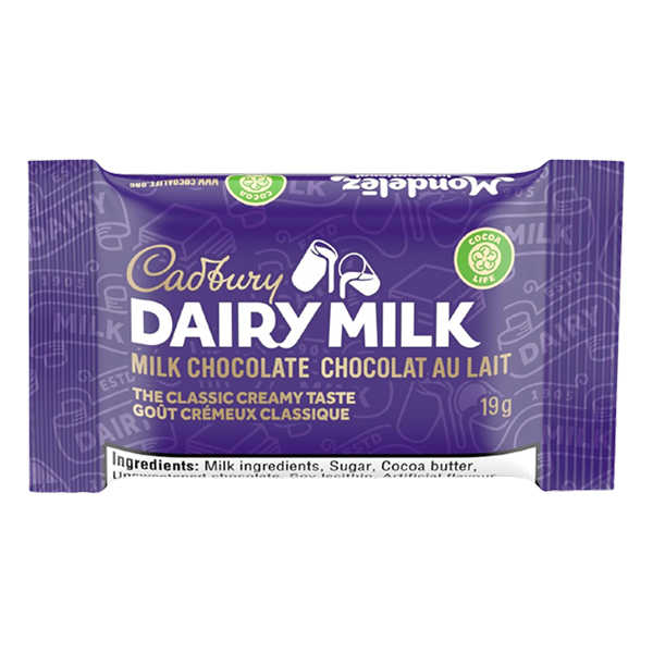 Classic, creamy Cadbury Dairy Milk in bite-sized portions. This share-size bag includes 19 mini bars, perfect for on-the-go snacking or sharing with loved ones.