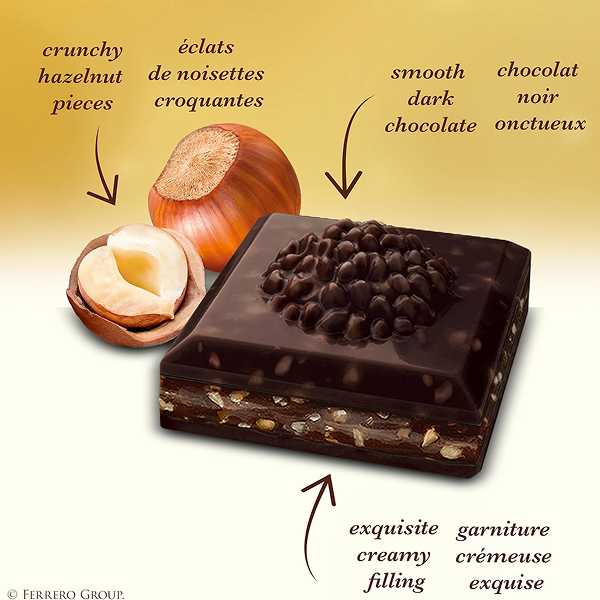 Indulge in the exquisite taste of Ferrero Rocher’s premium dark chocolate bars, filled with smooth hazelnut and rich cocoa. This pack includes 8 individually wrapped 90g bars, perfect for gifting or personal enjoyment.