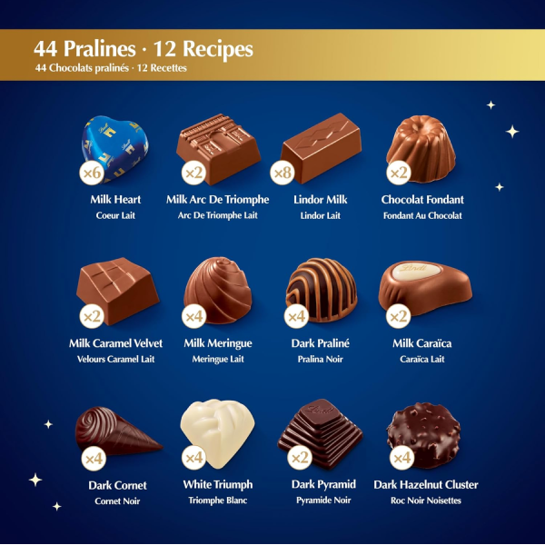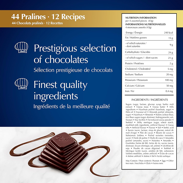 Transport yourself to the elegance of Paris with this exquisite selection of 44 pralines in 12 decadent varieties. Crafted by Lindt Maître Chocolatiers, this gift box is perfect for holiday gifting and special celebrations.